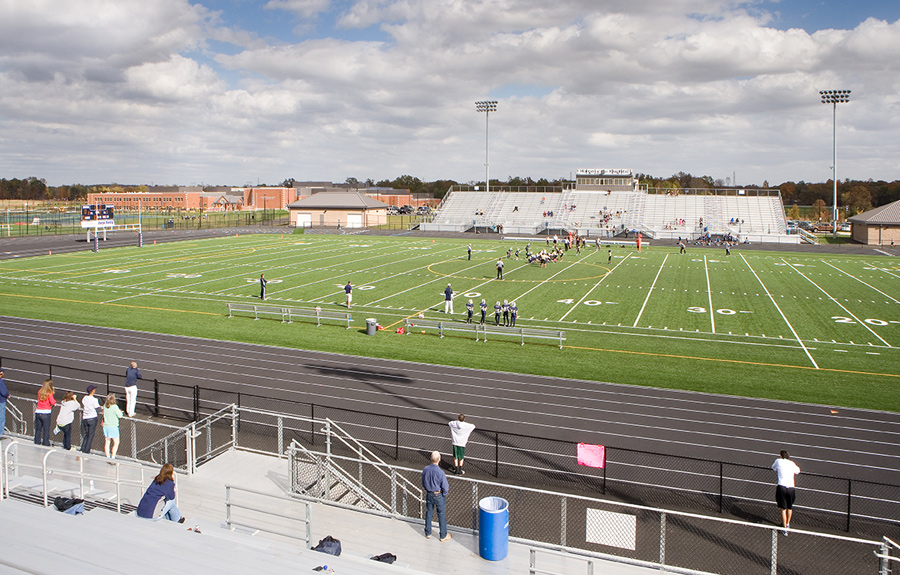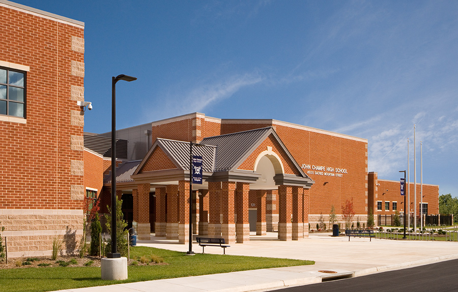 The 290,000 sq ft building is situated on a 100-acre wooded site in Aldie, Virginia. The state-of-the-art educational facility features artificial turf athletic fields, gymnasium, auxiliary gym, theater, cafeteria, and several laboratories. John Champe High School has quite a few environmental attractions including solar panels, high efficiency lighting, and environmentally friendly HVAC systems.
