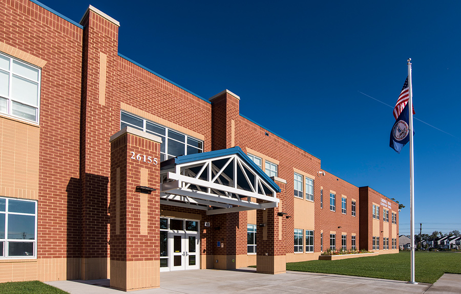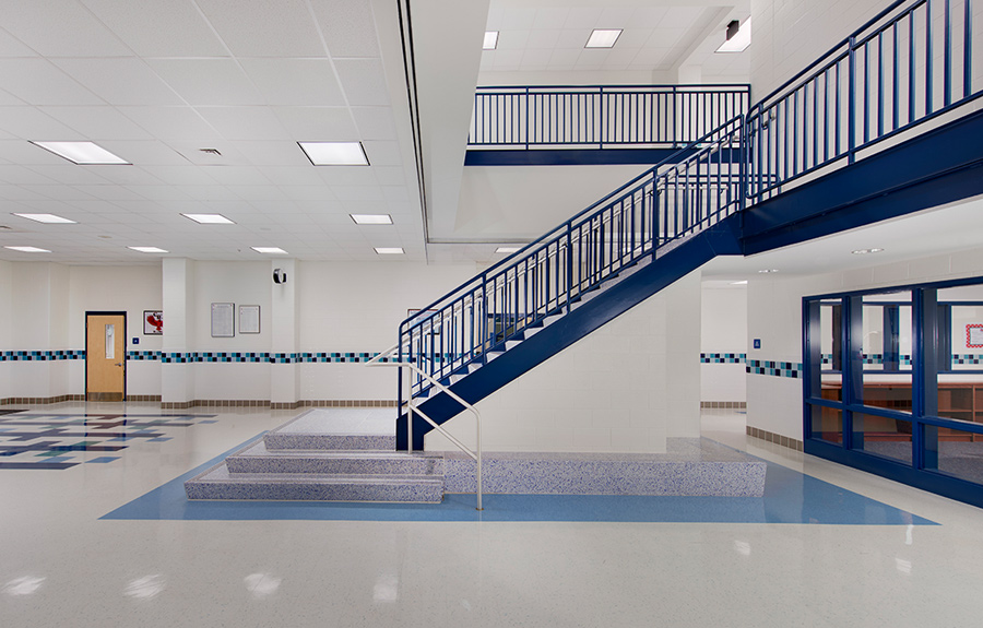 Interior finishes consist of painted CMU and drywall, acoustical ceilings, VCT flooring with precast terrazzo stair treads. Site amenities included a new soccer field, softball field and walking track.