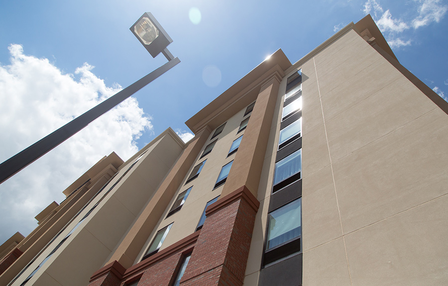 The hotel is eight stories and has amenities such as an indoor pool, exercise room, conference room, business center, breakfast area. Construction includes a concrete underground parking area for this pre-cast concrete plank structure.