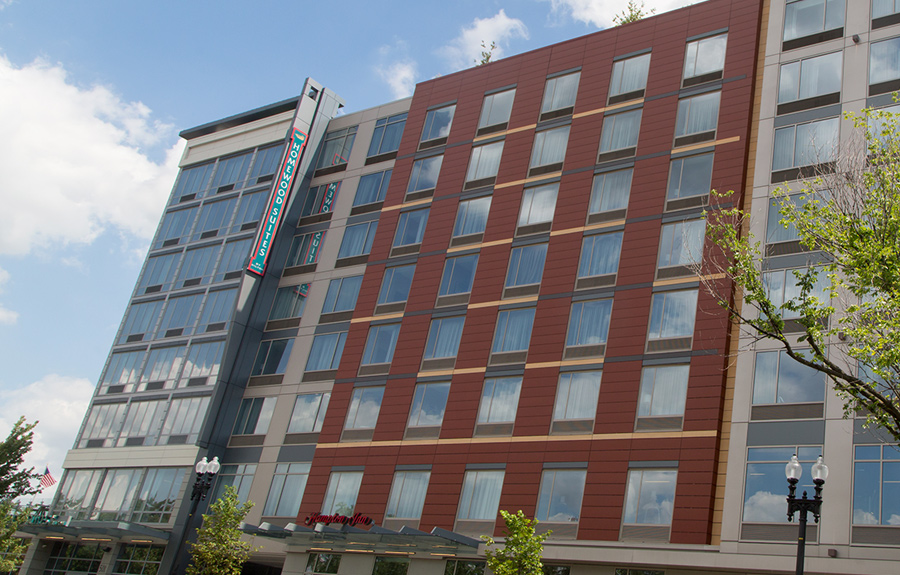 The main vehicle entrance will be off New York Avenue with the drive aisle splitting the two lobby entrances. The building exterior consists of structural metal stud, insulation, vapor barrier and rain screen. This LEED Silver hotel project is within walking distance of the NoMa Gallaudet metro station and a short car ride from downtown DC or Chinatown.