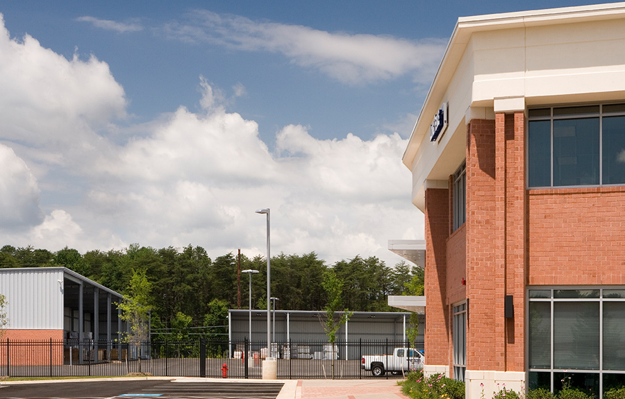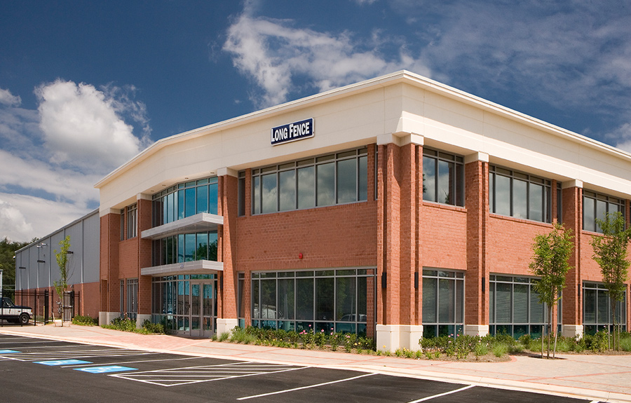 For the new regional headquarters for Long Fence, Inc. a combination of Pre-Engineered Metal Building warehouse adjoins a two story conventionally constructed office space. The 17,000 s.f. office space is masonry and steel bearing with built-up roofing. The 17,000 s.f. conditioned warehouse utilized sidelight panels to take advantage of natural light and sits upon a 10” reinforced concrete slab. Three separate three sided PEMB storage buildings were also constructed on the 4.6 acre site.